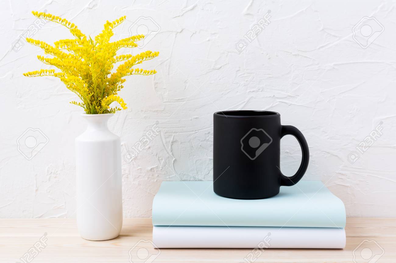 Black Coffee Mug Mockup With Chamomile Bouquet In Rustic Vase